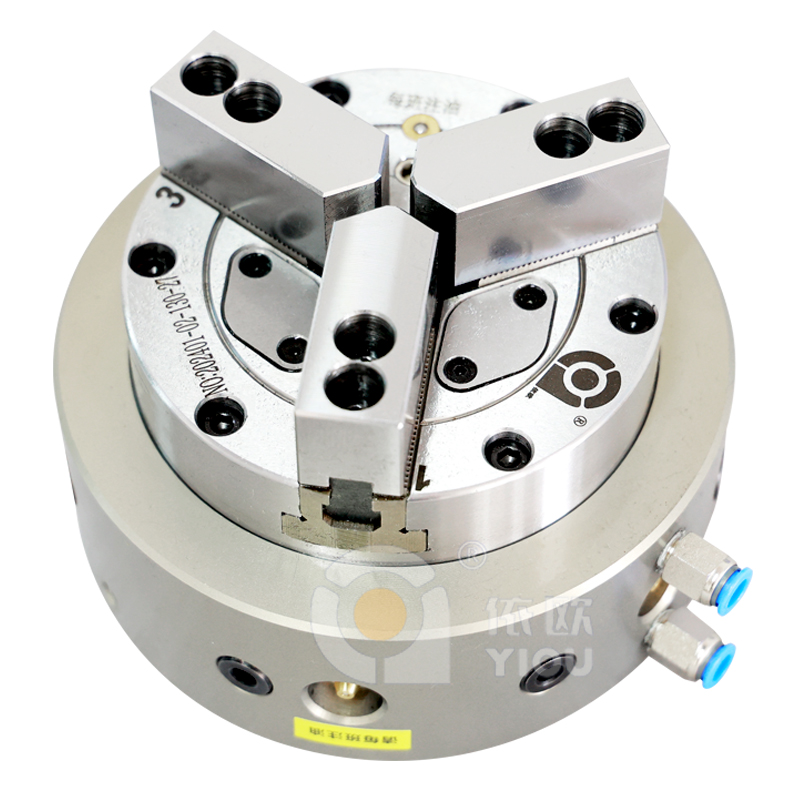 菜单产品中心 气动卡盘 前置式卡盘 切管卡盘 前置涨套 组合夹具 非标定制 液压卡盘 热门产品 →卧式二爪气动卡盘 →中空液压卡盘 您的位置:首页 >> 产品中心 >> 前置式卡盘 前置式三爪全通孔类别:前置式卡盘 该卡盘与主轴连接方式符合国家标准,用户不需改变机床结构,只需配备与机床、卡盘相符的连接法兰即可安装,十分方便。卡盘体即为气缸,内置活塞、逆止阀,超长时间保压功能(24小时以上),侧面旋转进气,实现夹紧与松开动作。该卡盘具有重量轻、孔径大、行程大、转速高等优势,适用于普通车床、管螺纹机床及焊接设备的配置。 联系我们 返回列表 产品说明 相关产品 前置式三爪全通孔 非标定制